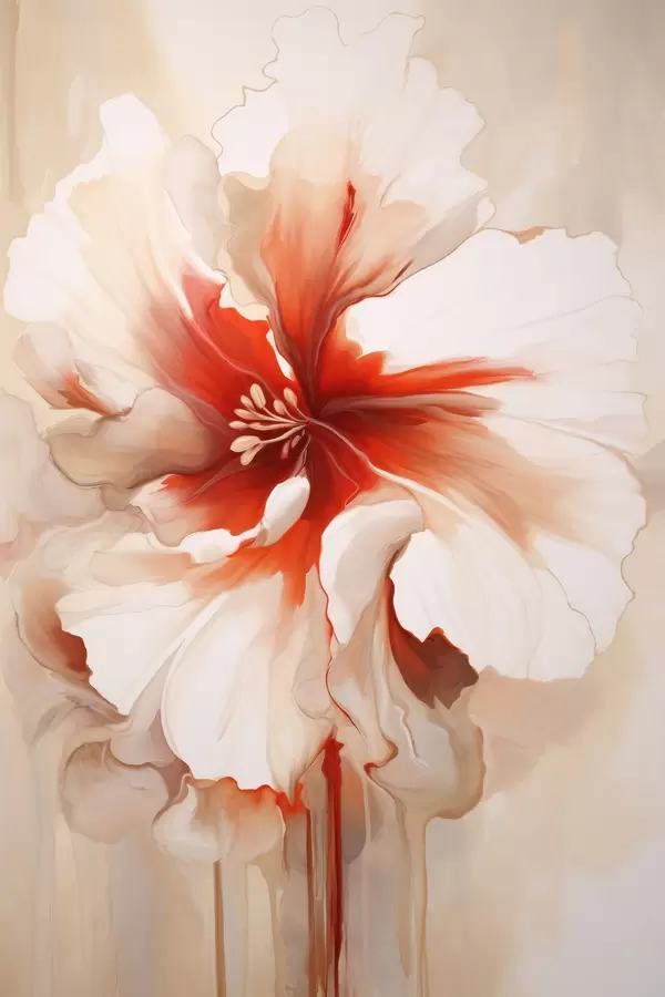 Poster Lähivõte valgest ja punasest õiest, millel on poolläbipaistvad kroonlehed ja voolavad värvitilgad. Nr f46941