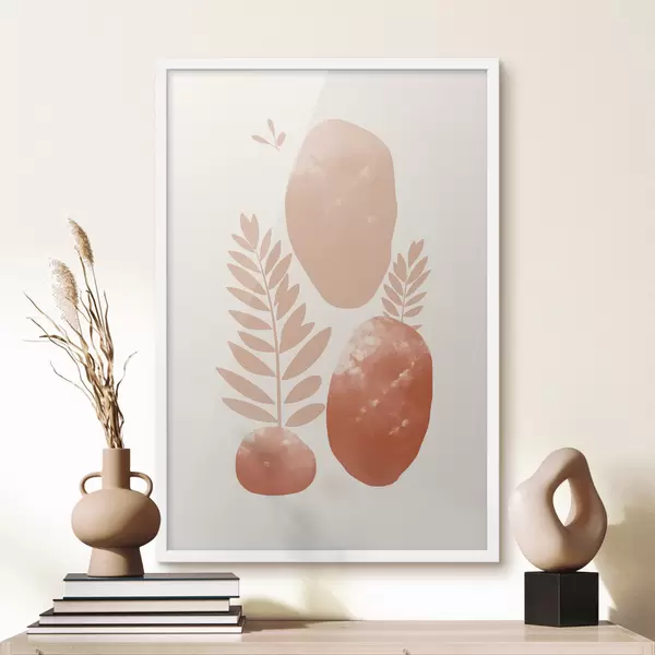 Poster Abstraktsed kujundid tekstuuriga kivid ja lehed vaoshoitud virsiku- ja terrakotta toonides, minimalistlik, kreemikas taust Nr f47012