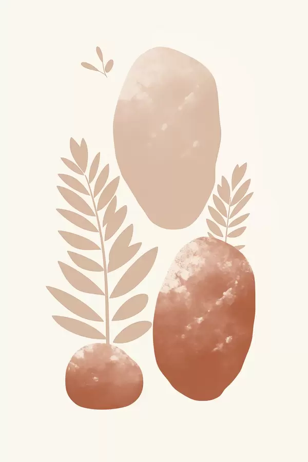 Poster Abstraktsed kujundid tekstuuriga kivid ja lehed vaoshoitud virsiku- ja terrakotta toonides, minimalistlik, kreemikas taust Nr f47012