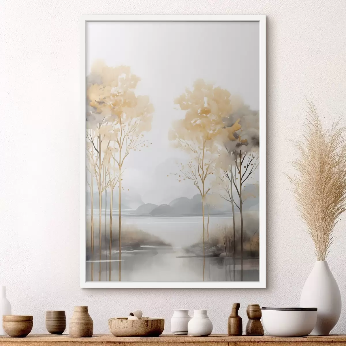 Poster Dekoratiivne abstraktne maastik, kõrged puud kollaste lehtedega, jõgi ja udu taustal Nr f47015