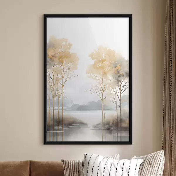 Plakat Dekoratiivne abstraktne maastik, kõrged puud kollaste lehtedega, jõgi ja udu taustal f47015