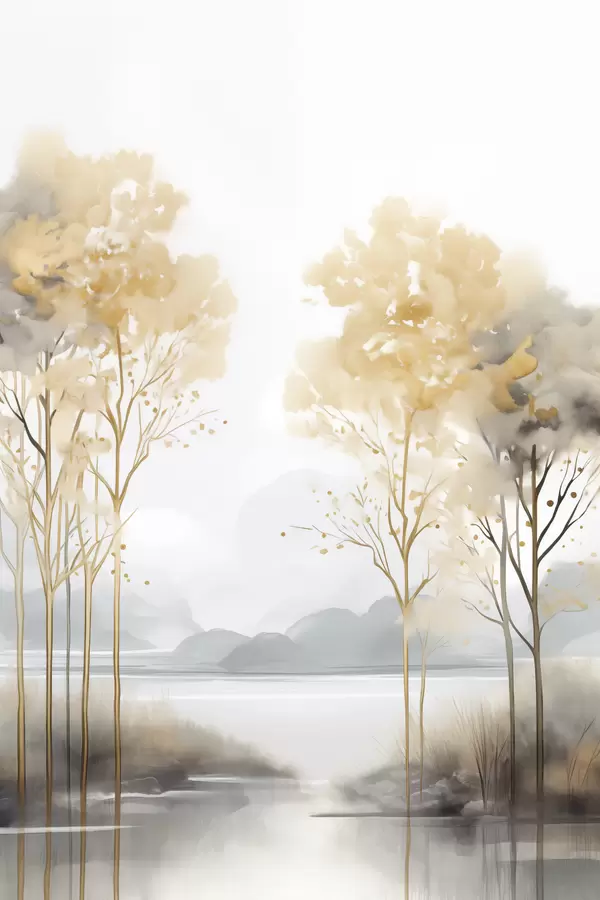Poster Dekoratiivne abstraktne maastik, kõrged puud kollaste lehtedega, jõgi ja udu taustal Nr f47015