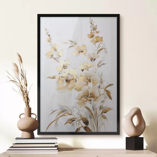Poster Tekstuuriga kollased õied ja lehed valgel taustal, delikaatsete pintslitõmmetega Nr f47016