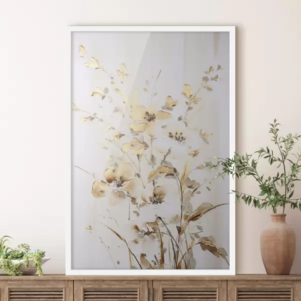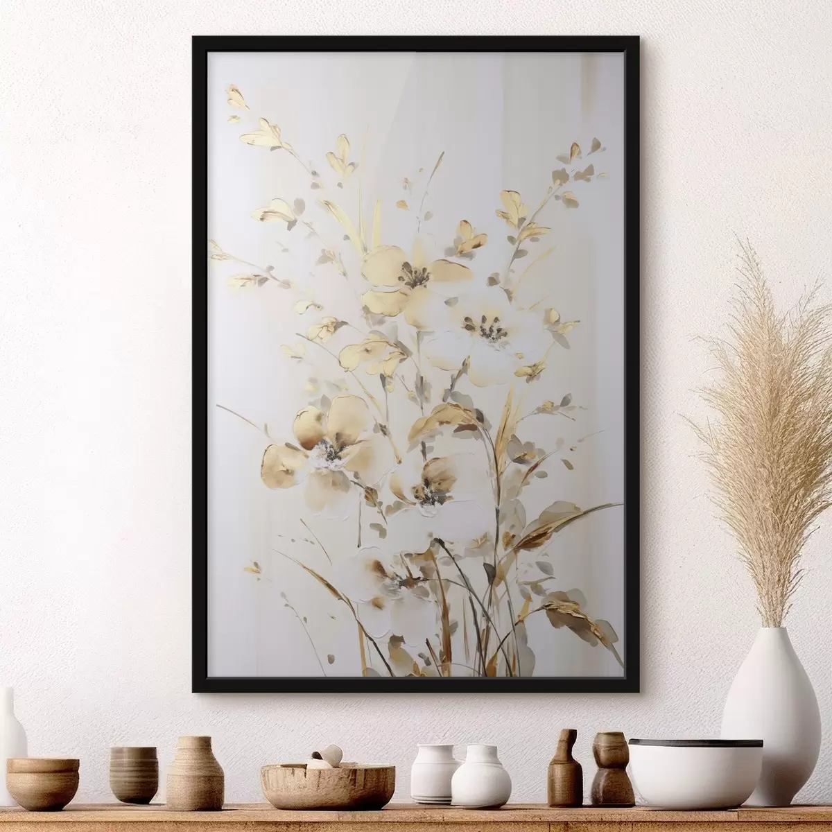 Poster Tekstuuriga kollased õied ja lehed valgel taustal, delikaatsete pintslitõmmetega Nr f47017