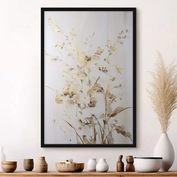 Plakat Tekstuuriga kollased õied ja lehed valgel taustal, delikaatsete pintslitõmmetega f47017