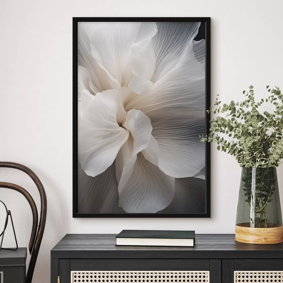 Poster Lähedalt võetud foto õrnade abstraktsete valgetest õielehtedest, millel on keerulised jooned ja ähmane tume taust. Nr f47018