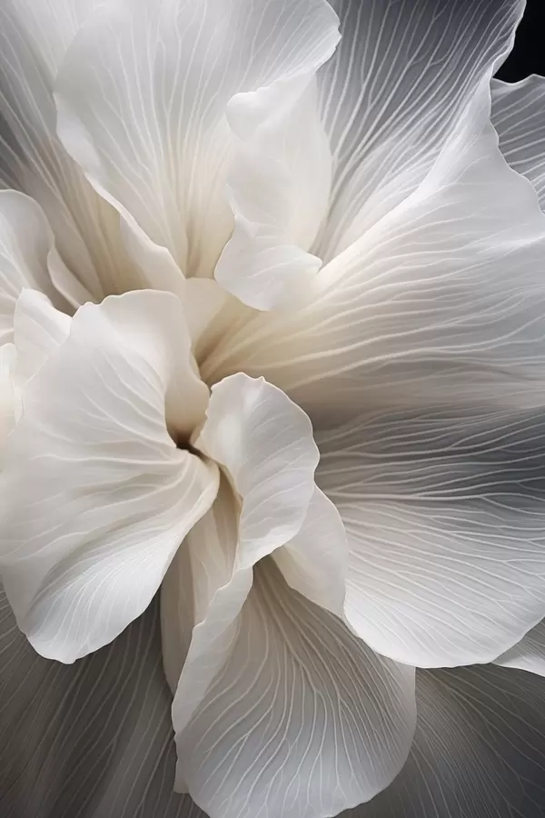 Poster Lähedalt võetud foto õrnade abstraktsete valgetest õielehtedest, millel on keerulised jooned ja ähmane tume taust Nr f47018