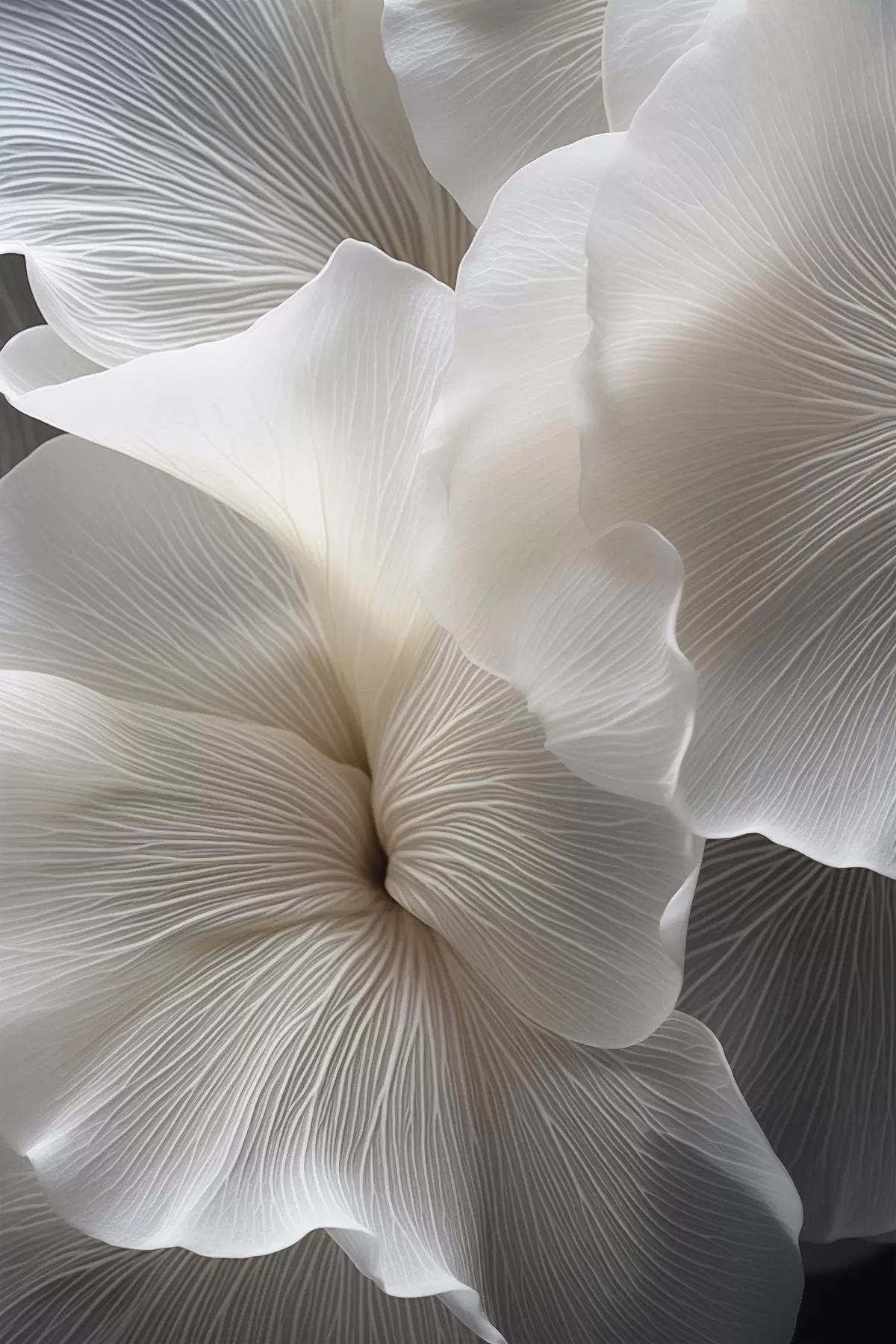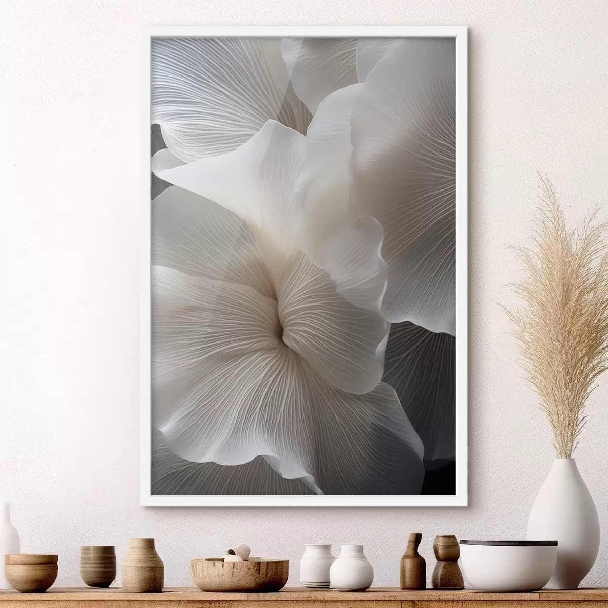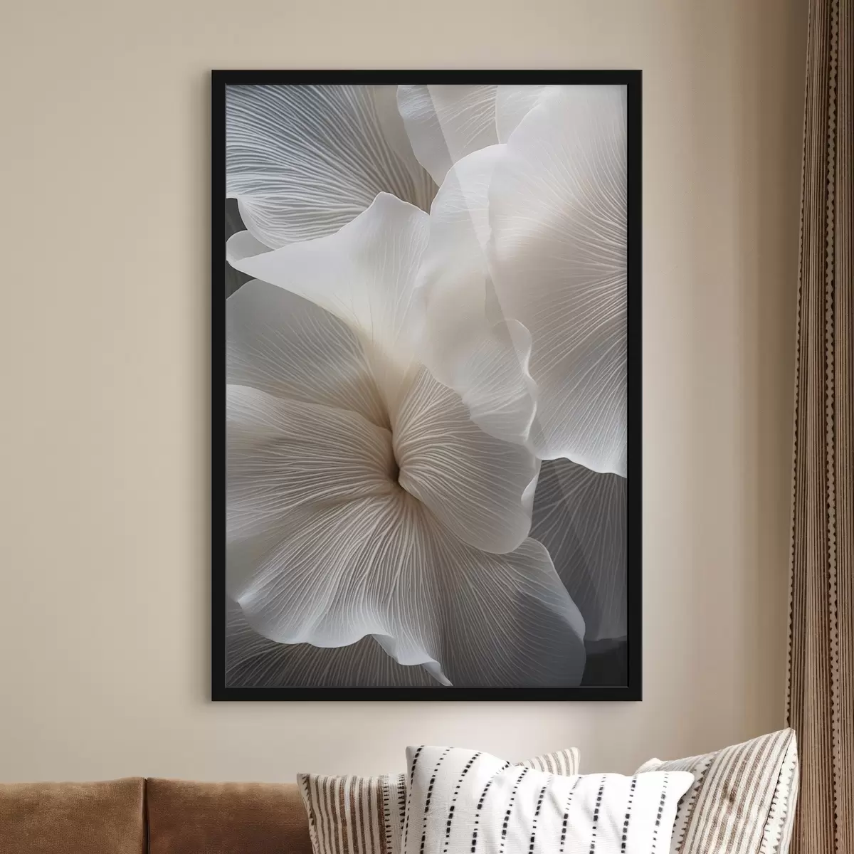 Poster Lähedalt võetud foto õrnade abstraktsete valgetest õielehtedest, millel on keerulised jooned ja ähmane tume taust. Nr f47019