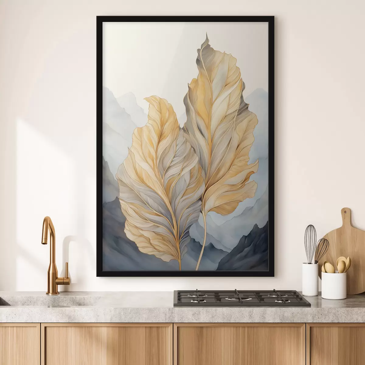 Poster Abstraktsed suured, kollased ja pruunid lehed keeruliste detailidega, mäestiku taustal Nr f47023