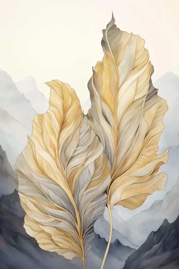 Poster Abstraktsed suured, kollased ja pruunid lehed keeruliste detailidega, mäestiku taustal Nr f47023