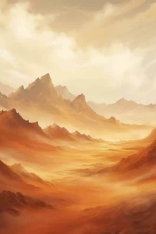 Plakat Lai oranž kõrbe maastik, kus kõrguvad kaljused mäed uduse, päikesepaistelise taeva all, millel on õhukesed pilved f47029