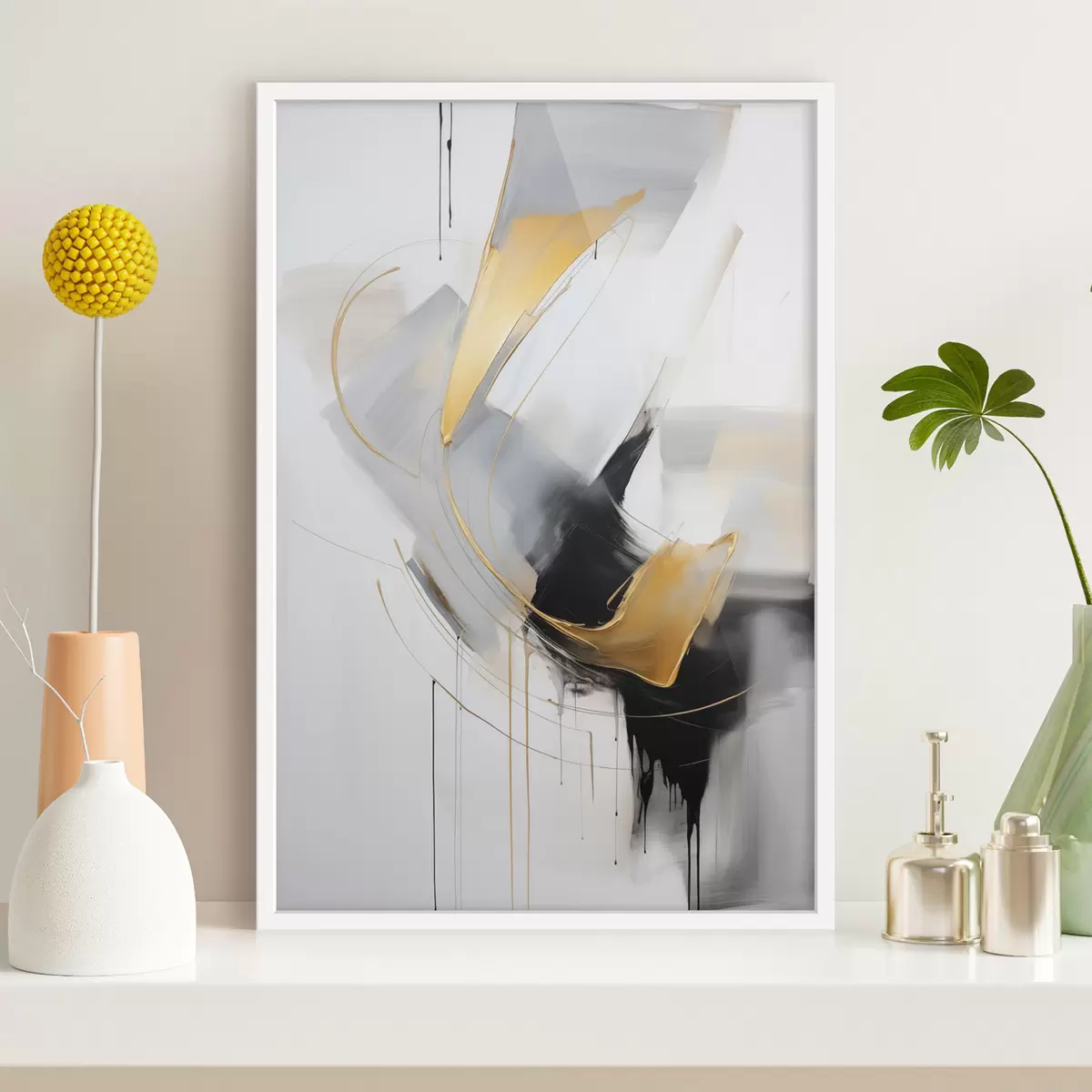 Poster Abstraktne maal kollaste, mustade ja valgetega pintslitõmmetega, dünaamilised jooned Nr f47034