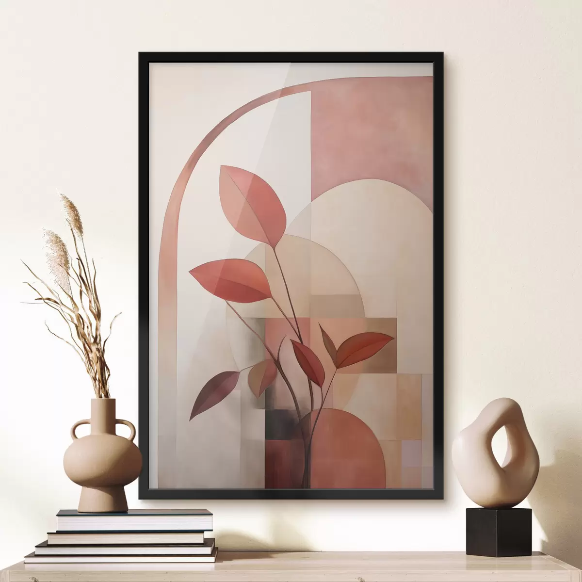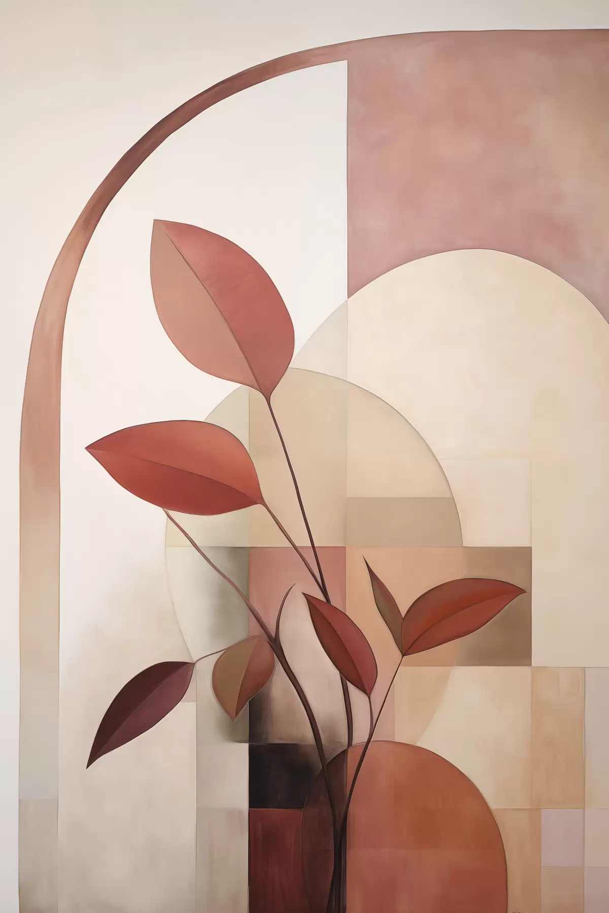 Poster Abstraktne taim punaste lehtedega geomeetriliste kujundite ja pehmete, summutatud värvide taustal Nr f47040