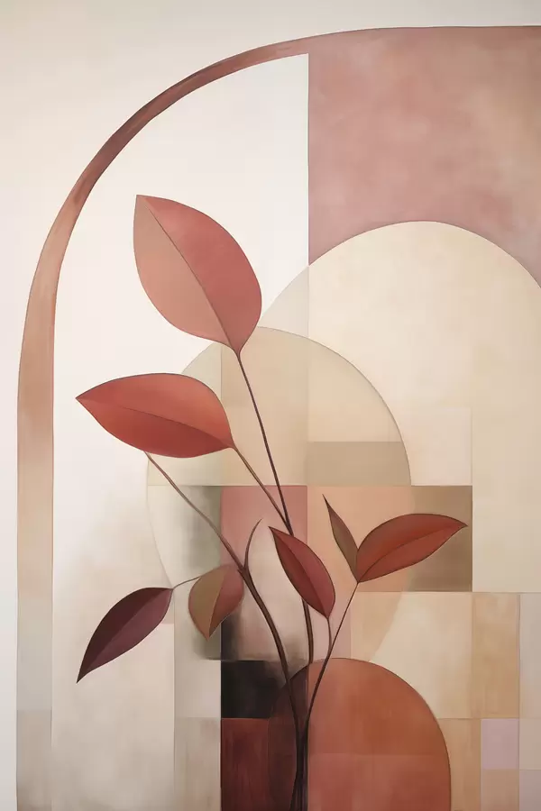 Poster Abstraktne taim punaste lehtedega geomeetriliste kujundite ja pehmete, summutatud värvide taustal Nr f47040