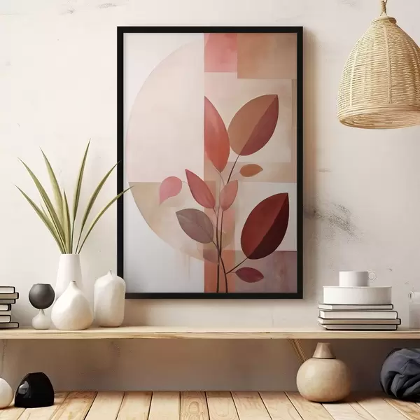 Poster Abstraktne taim punaste lehtedega geomeetriliste kujundite ja pehmete, summutatud värvide taustal Nr f47041