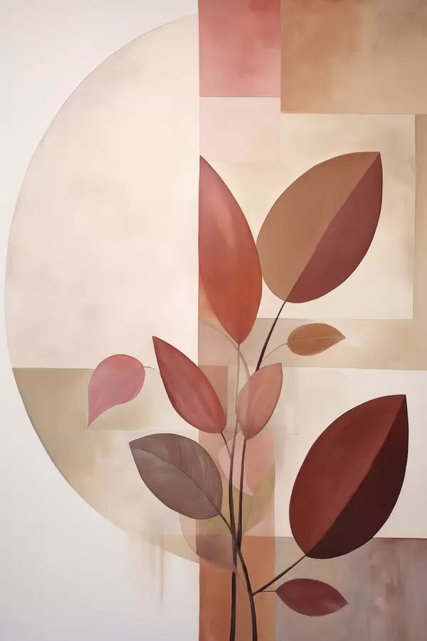 Poster Abstraktne taim punaste lehtedega geomeetriliste kujundite ja pehmete, summutatud värvide taustal Nr f47041