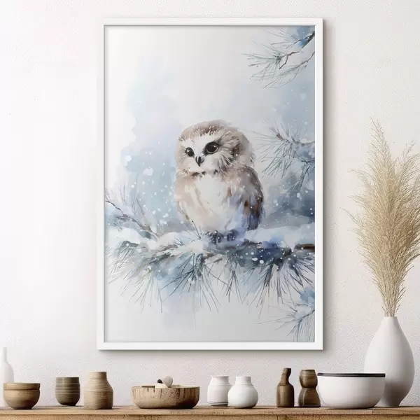 Poster akvarellistiilis armas öökull lumega kaetud männipuu oksal Nr f47115