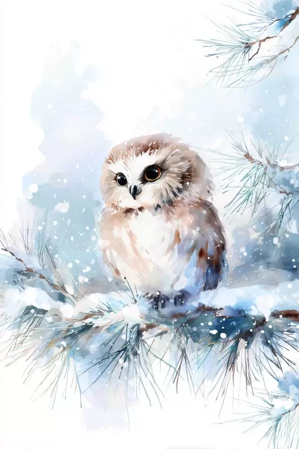 Poster akvarellistiilis armas öökull lumega kaetud männipuu oksal Nr f47115