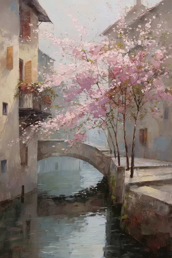 Poster romantiline linnamaastik õitsva puuga õlimaalistiilis Nr f47127