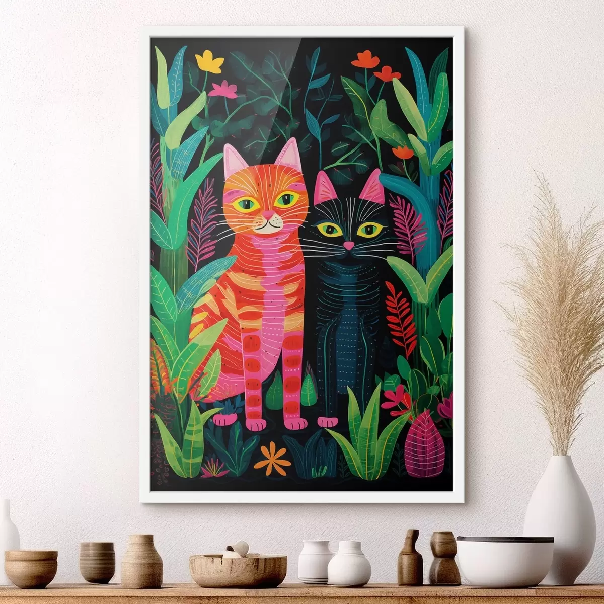 Plakat Kaks stiliseeritud kassi erksavärviliste taimede seas f47298