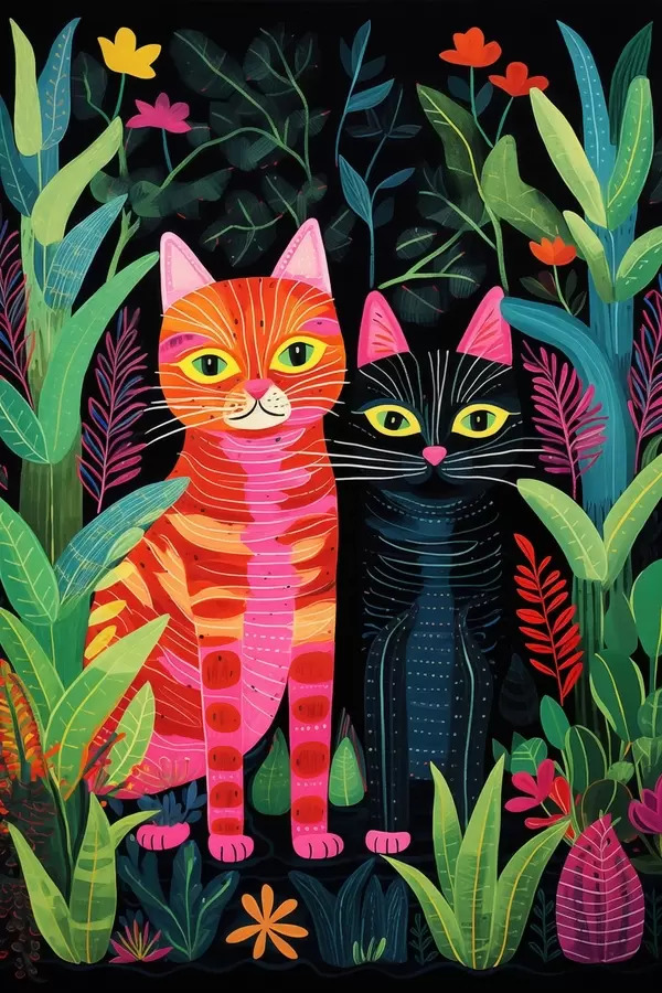 Poster Kaks stiliseeritud kassi erksavärviliste taimede seas Nr f47298