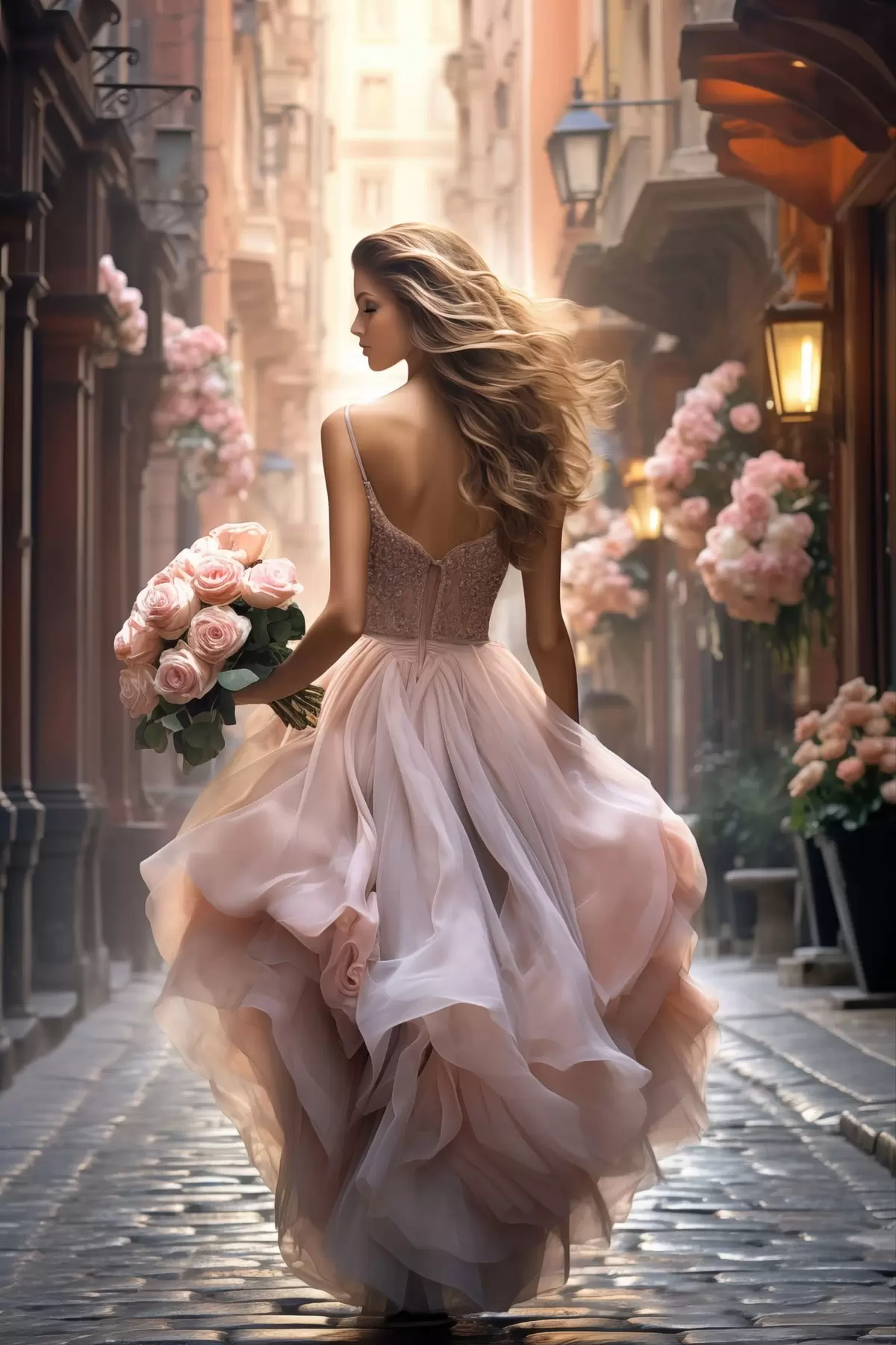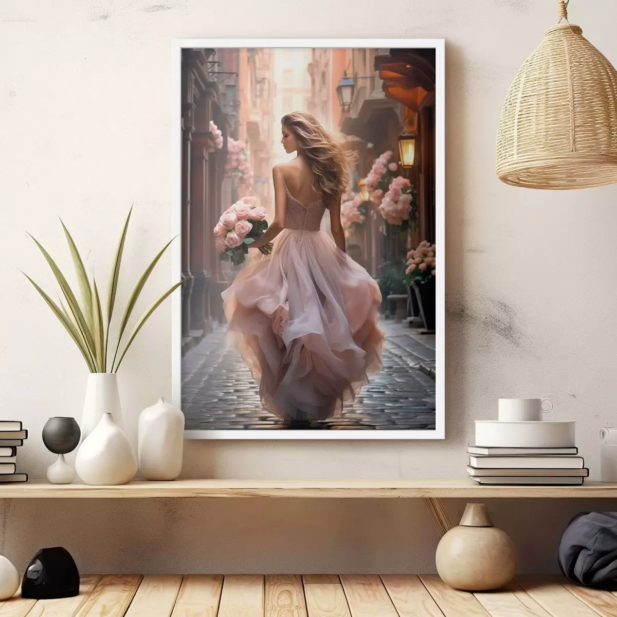 Poster Roosas kleidis naine kõnnib mööda tänavat Nr f47316