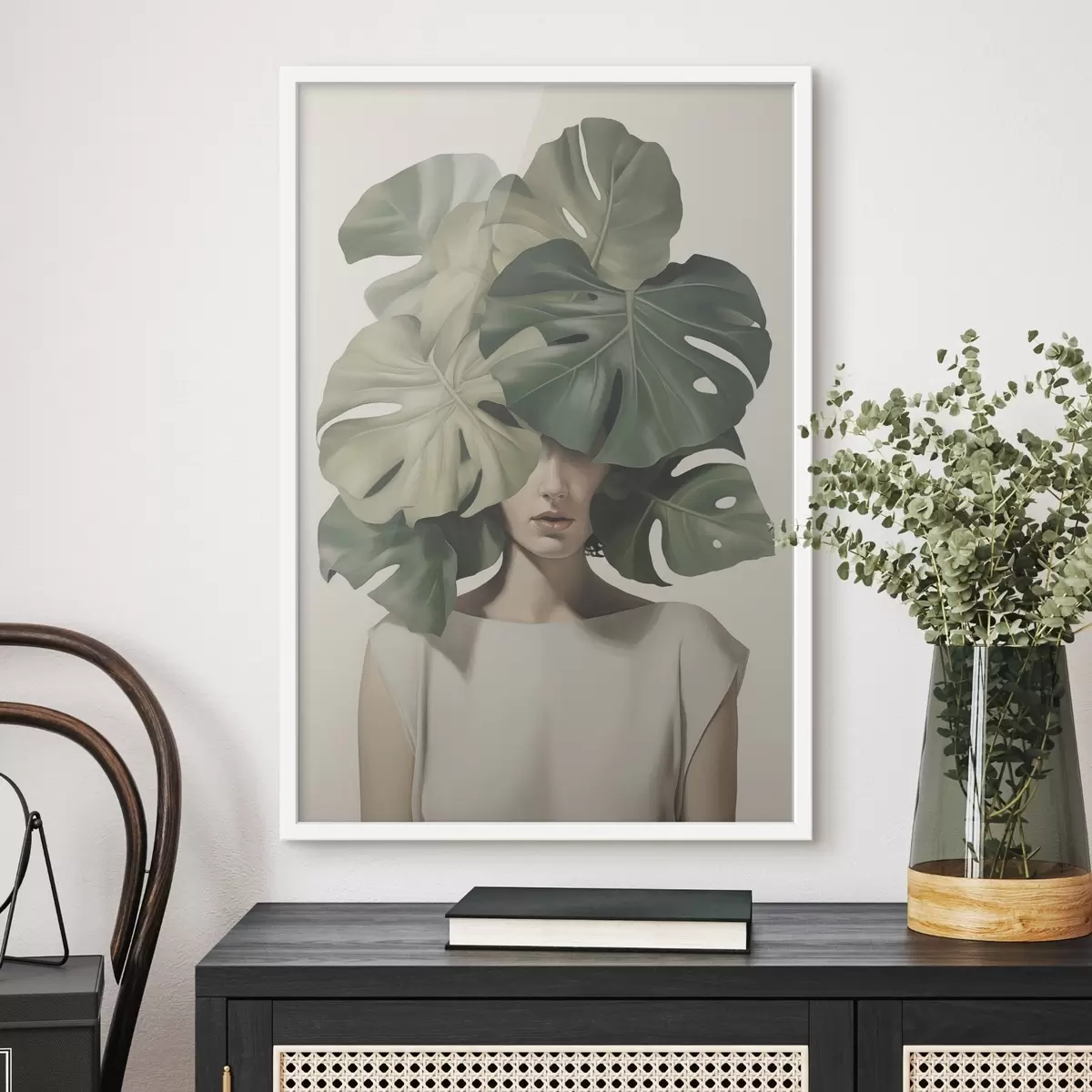 Plakat Abstraktne portree tüdrukust monsteralehtedega f47336