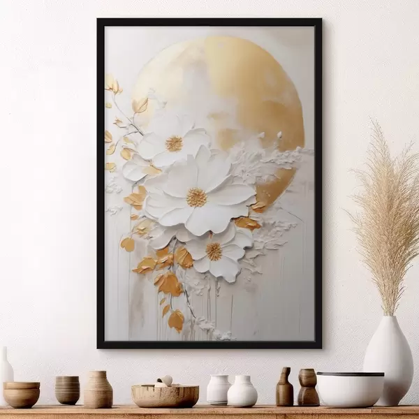 Plakat Valged lilled kollaste aktsentidega ja õrnad lehed tekstuurse taustaga, modernne kunst f47414