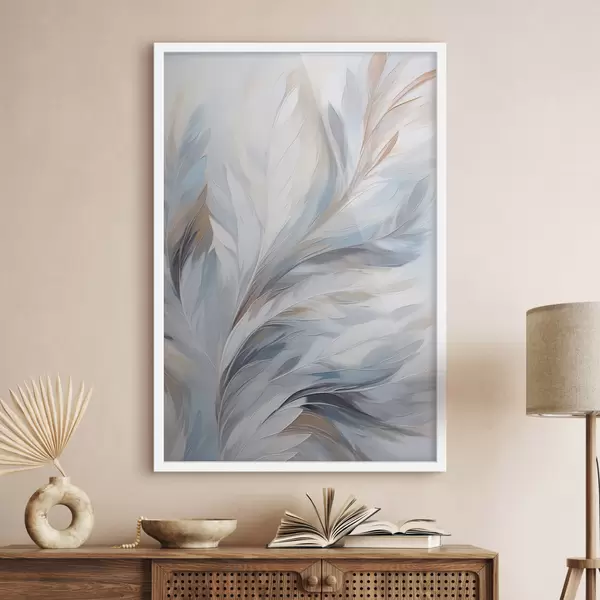 Plakat Õrn helesinine ja pruun sulg pehme, õhulise tekstuuriga, valgel taustal f47416