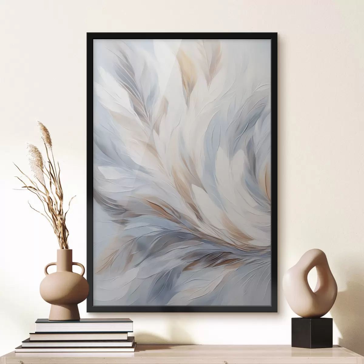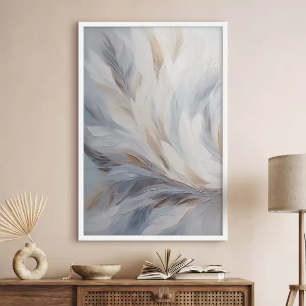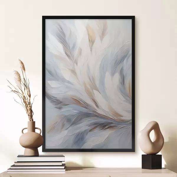 Poster Abstraktne maal sulgedest valge, sinise ja pruuni toonides, pehme, voolava tekstuuri ja heleda taustaga. Nr f47417
