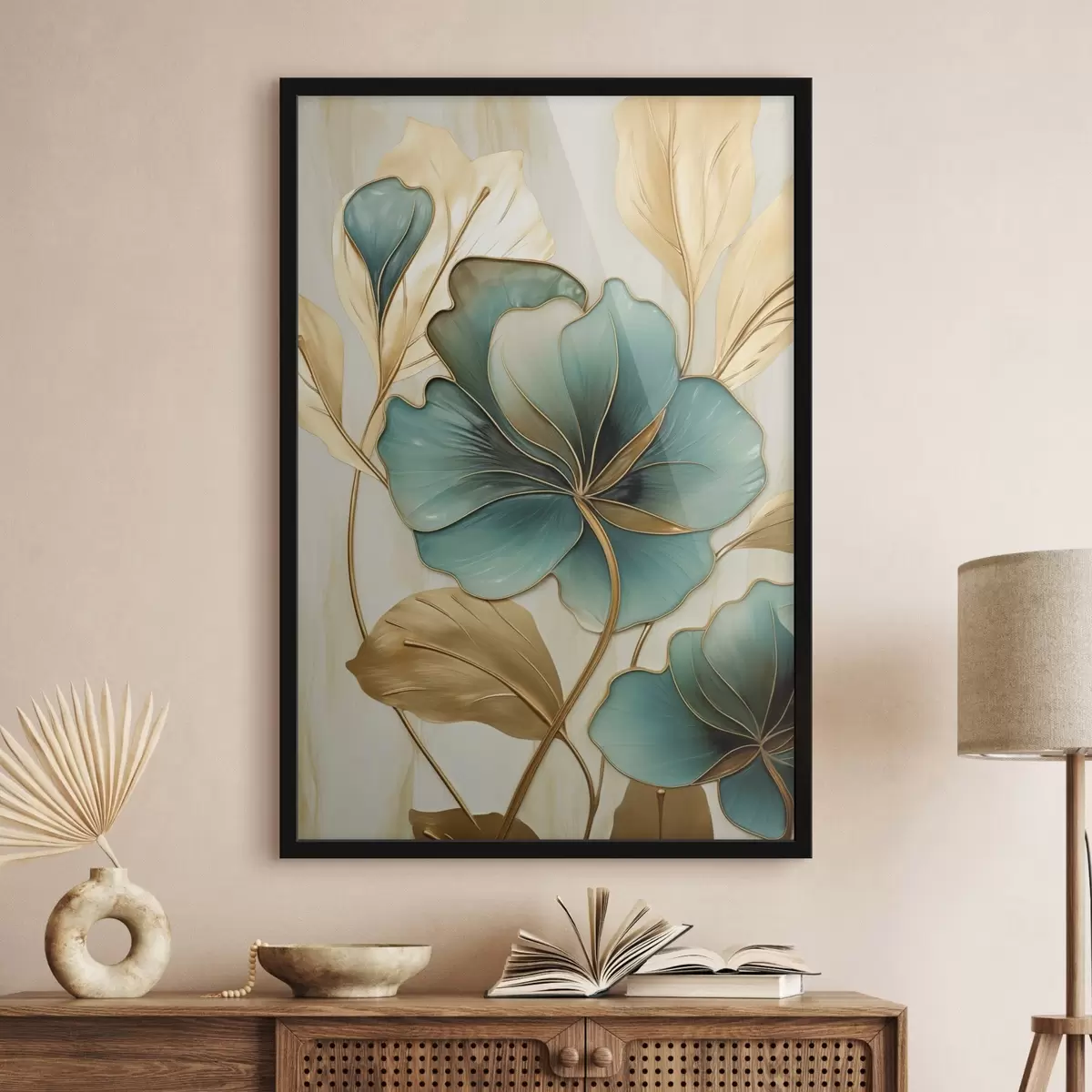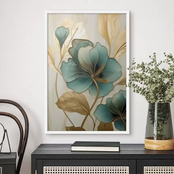 Poster Suured sinakasrohelised ja kollased kontuuridega õied, ümbritsetud kollastest lehtedest abstraktse taustaga Nr f47419