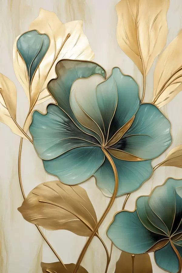Poster Suured sinakasrohelised ja kollased kontuuridega õied, ümbritsetud kollastest lehtedest abstraktse taustaga Nr f47419