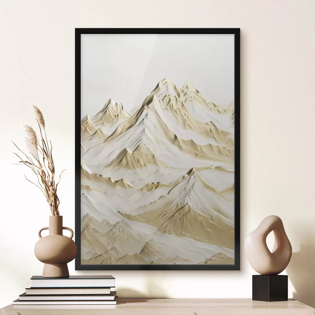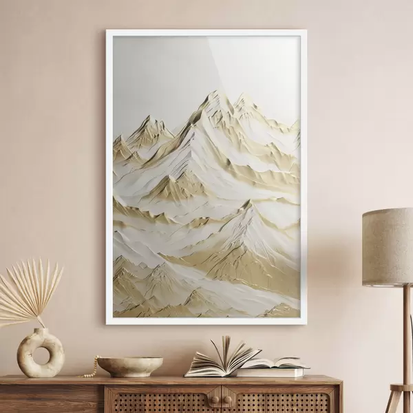 Plakat Kollane maastik, lumiste mäetippude ja sügavate orgudega heleda taeva all f47420