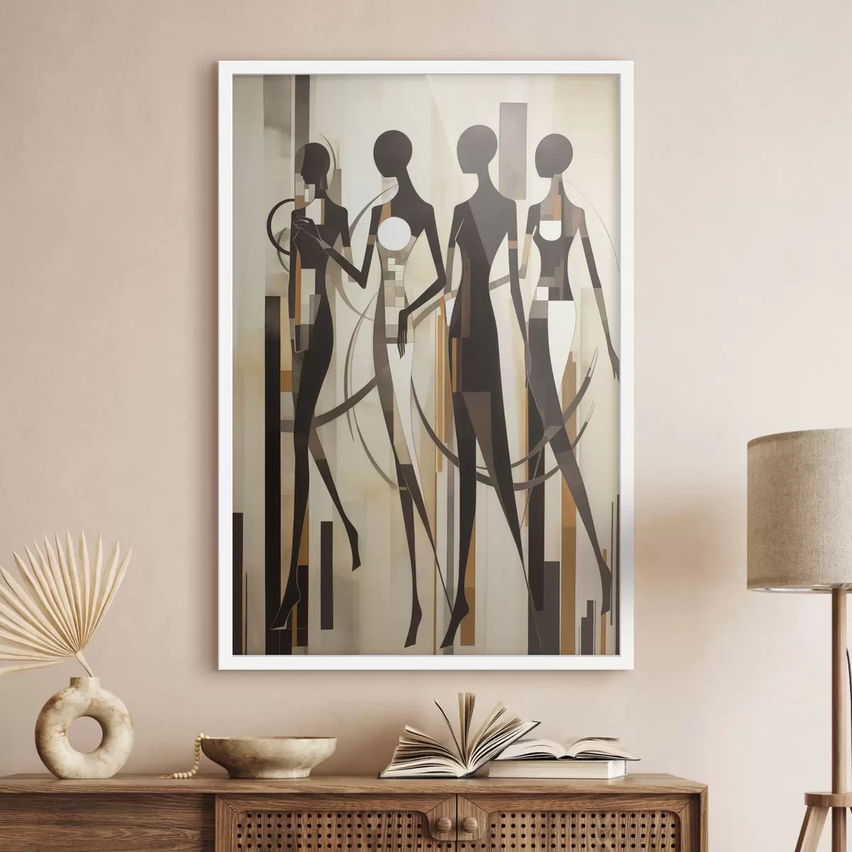 Poster Stiliseeritud naisfiguurid geomeetriliste elementidega vertikaalsete joonte abstraktsel taustal Nr f47423