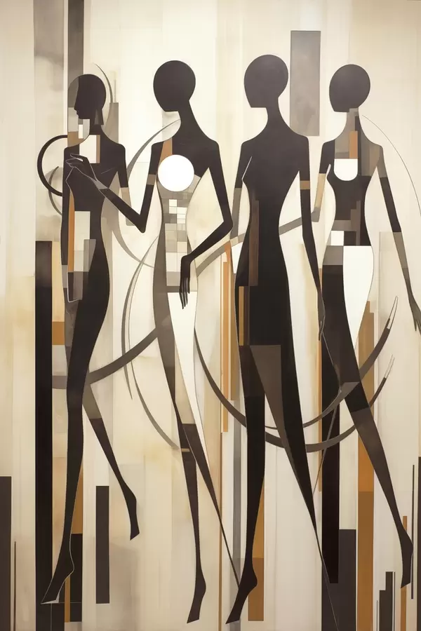 Poster Stiliseeritud naisfiguurid geomeetriliste elementidega vertikaalsete joonte abstraktsel taustal Nr f47423