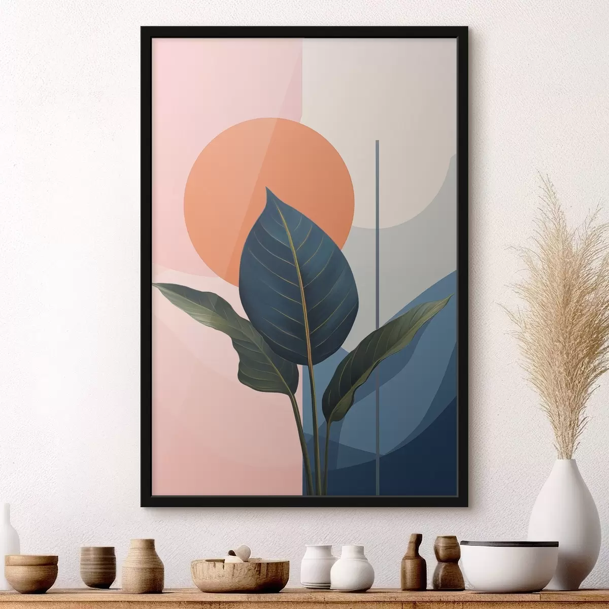 Poster Tumedad lehed abstraktsete kujundite taustal virsiku- ja halli värvitoonides, oranži ringiga Nr f47425
