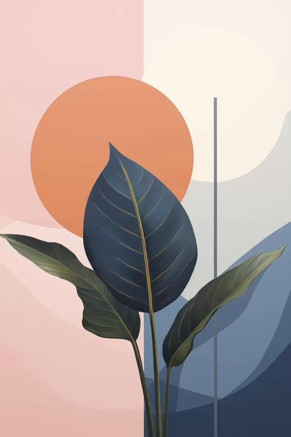 Poster Tumedad lehed abstraktsete kujundite taustal virsiku- ja halli värvitoonides, oranži ringiga Nr f47425