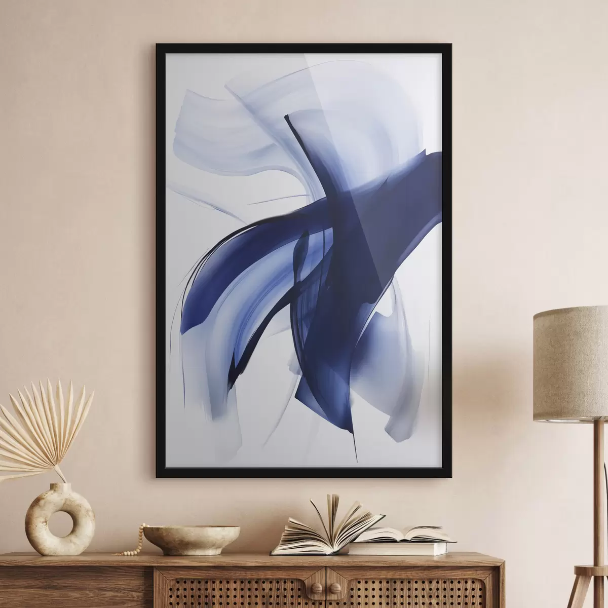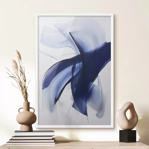 Plakat Abstraktsed sinised pintslitõmbe-taolised kujundid voolavate joonte ja kõverustega valgel taustal, modernne kunst f47429