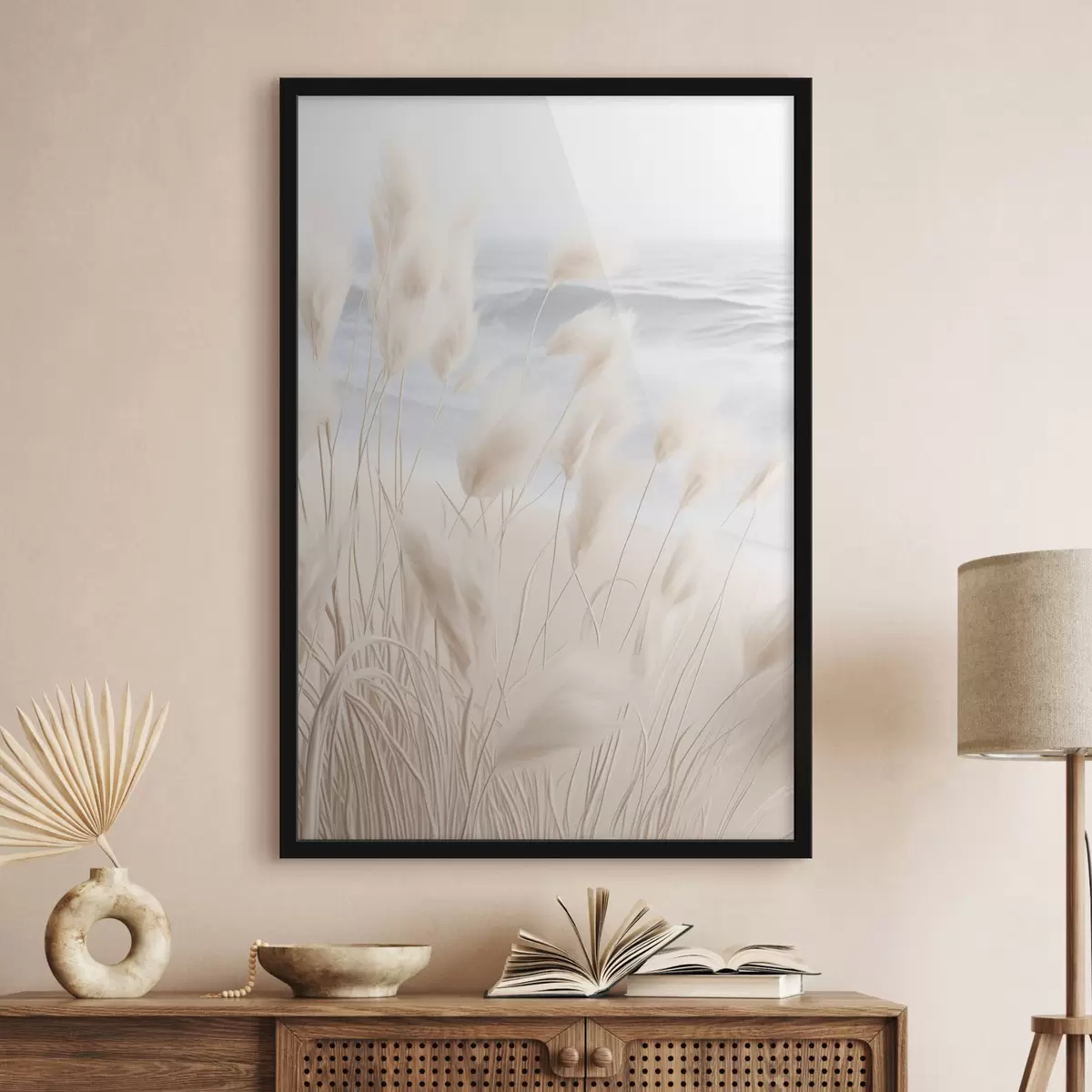 Plakat Esiplaanil pikk, sulgkerge pampasrohi pehmetes beežides toonides, taustal liivane rand. f47432