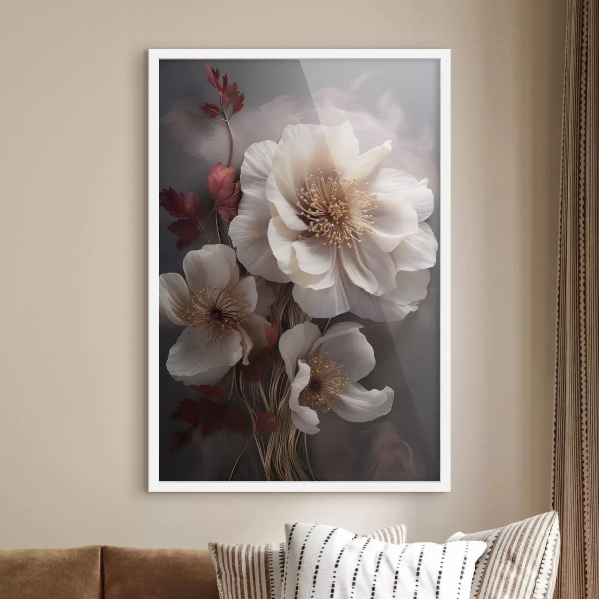 Plakat Õrnad peonid õhukeste, õrnad õielehed, ümbritsetud tumepunastest lehtedest abstraktse taustaga f47434