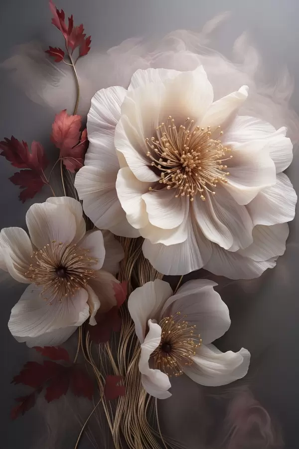 Plakat Õrnad peonid õhukeste, õrnad õielehed, ümbritsetud tumepunastest lehtedest abstraktse taustaga f47434