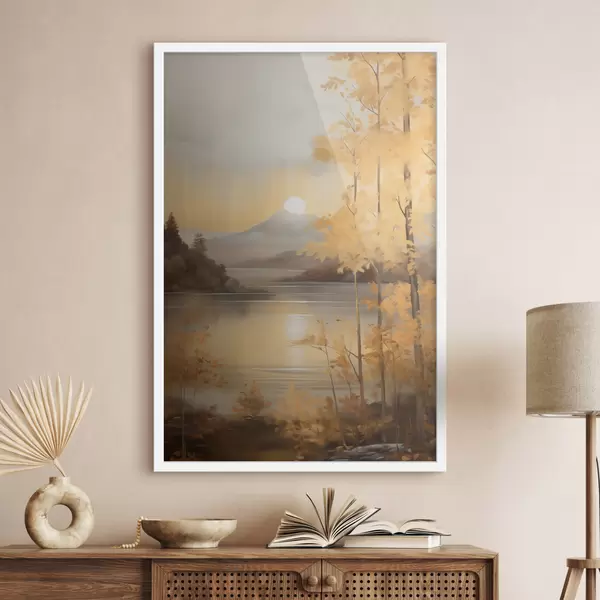 Poster Sügisene tekstuuriga puud oranžide lehtedega raamivad rahulikku järve kauguses asuvate mägedega pilvise taeva all. Nr f47440