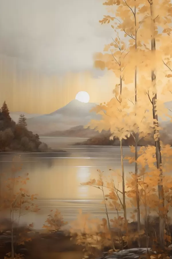 Poster Sügisene tekstuuriga puud oranžide lehtedega raamivad rahulikku järve kauguses asuvate mägedega pilvise taeva all. Nr f47440