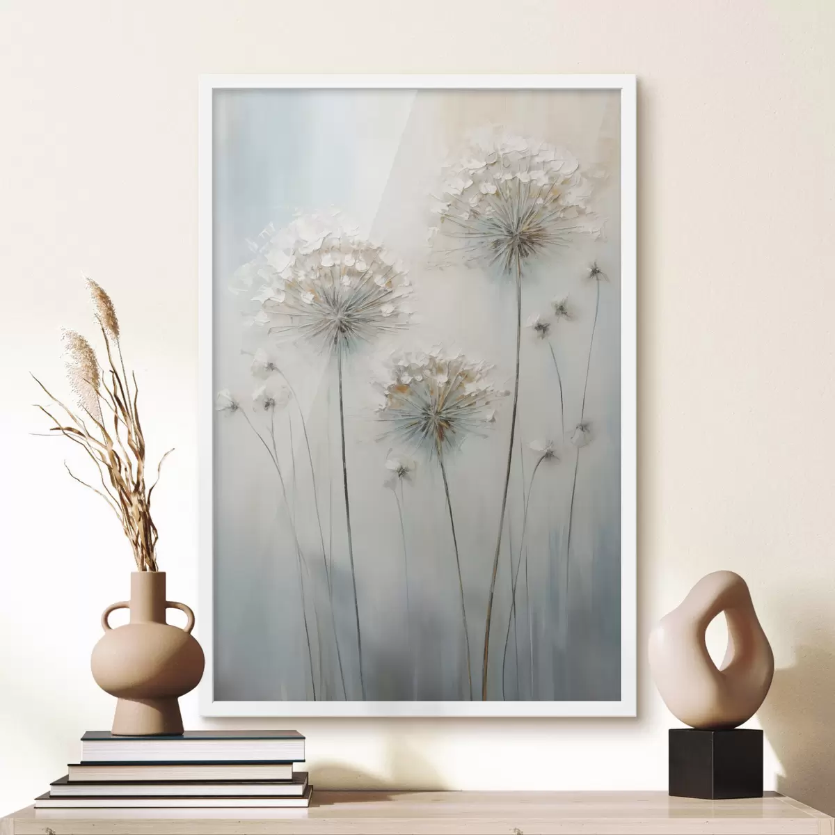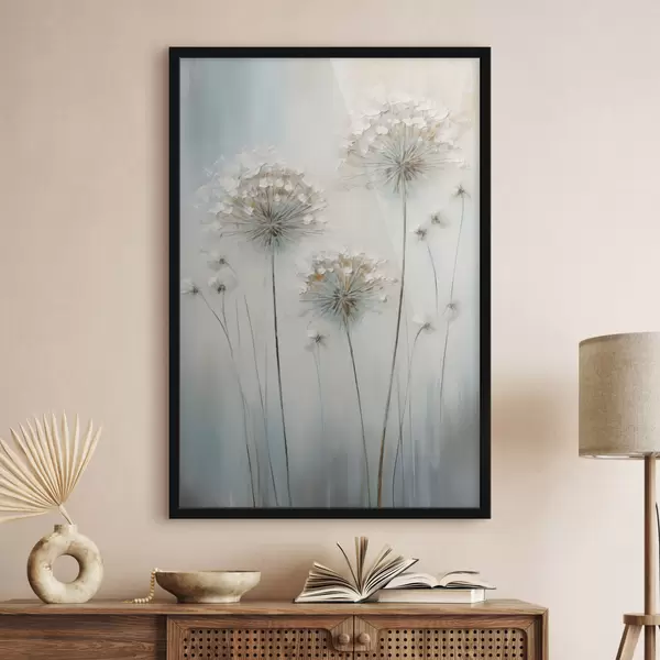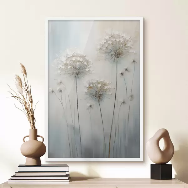 Poster Tekstuuriga maalistiil, millel on kujutatud võililled pehme sinise ja valge taustaga Nr f47855