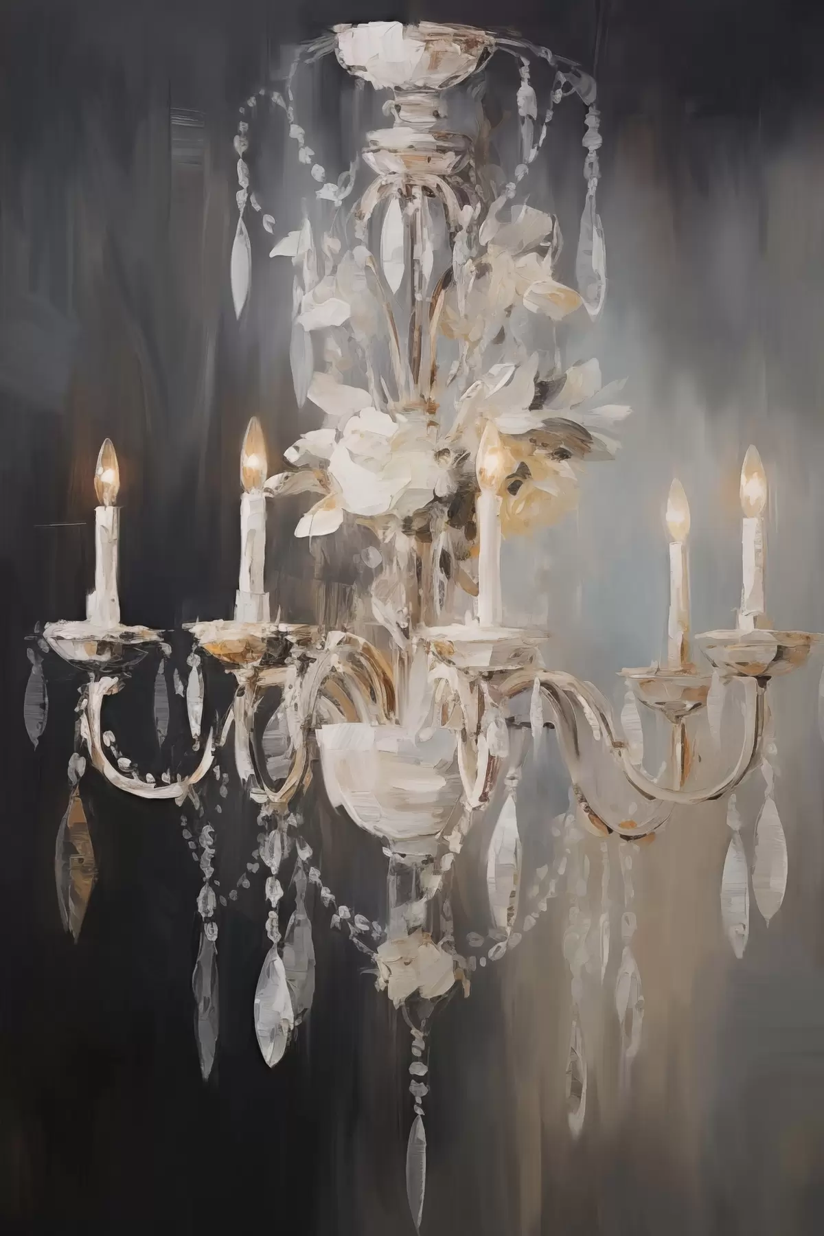 Plakat Abstraktne kaunistatud lühtri kujutis süüdatud küünaldega ja lillede motiividega tumedal tekstuurse taustaga f47857