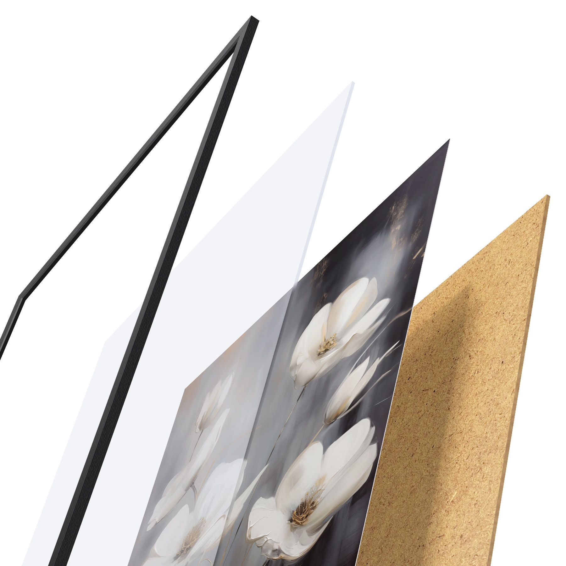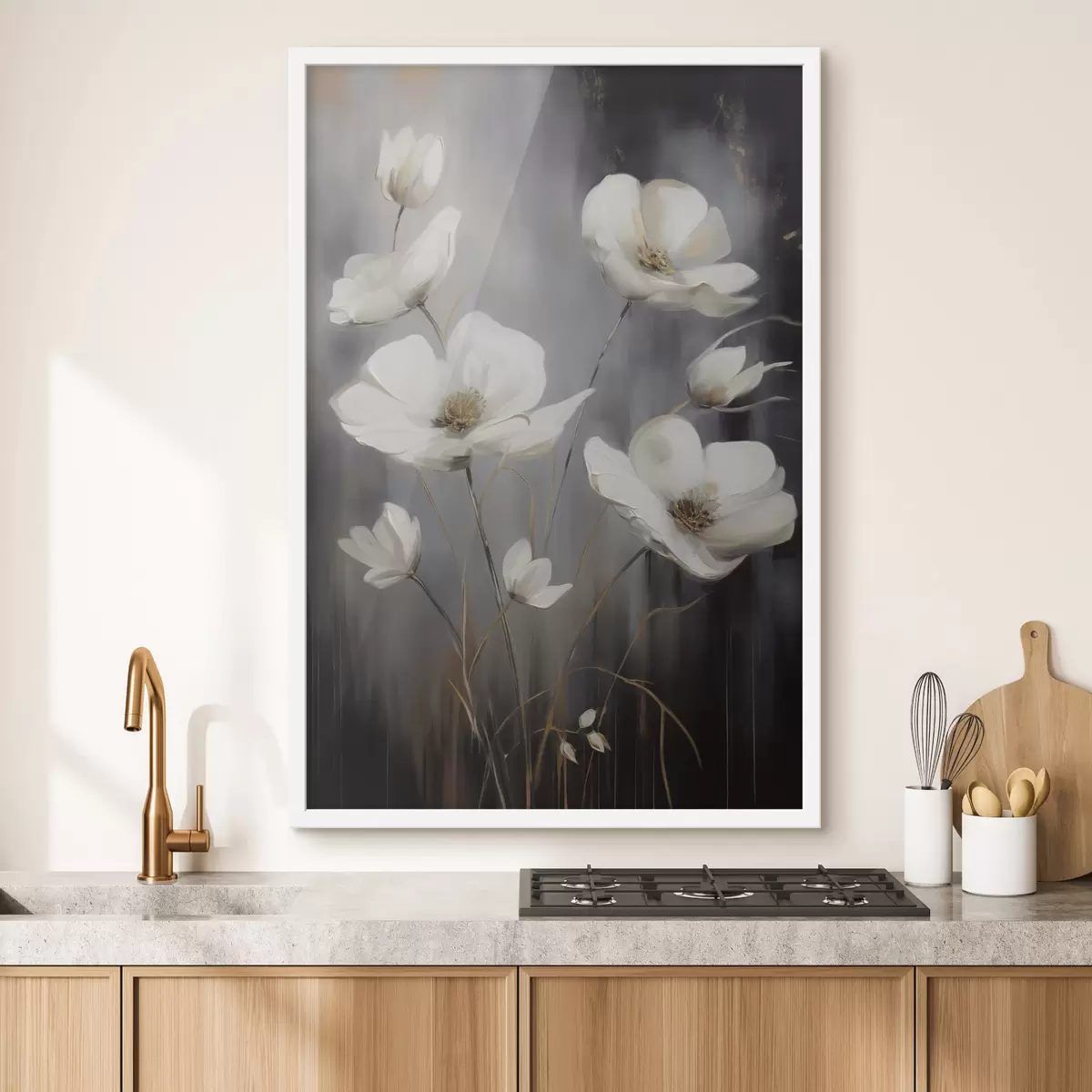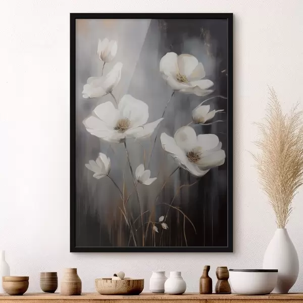 Poster Valged õied pruuni südamikuga ja õhukeste vartega tumedal, tekstuurse taustaga Nr f47858