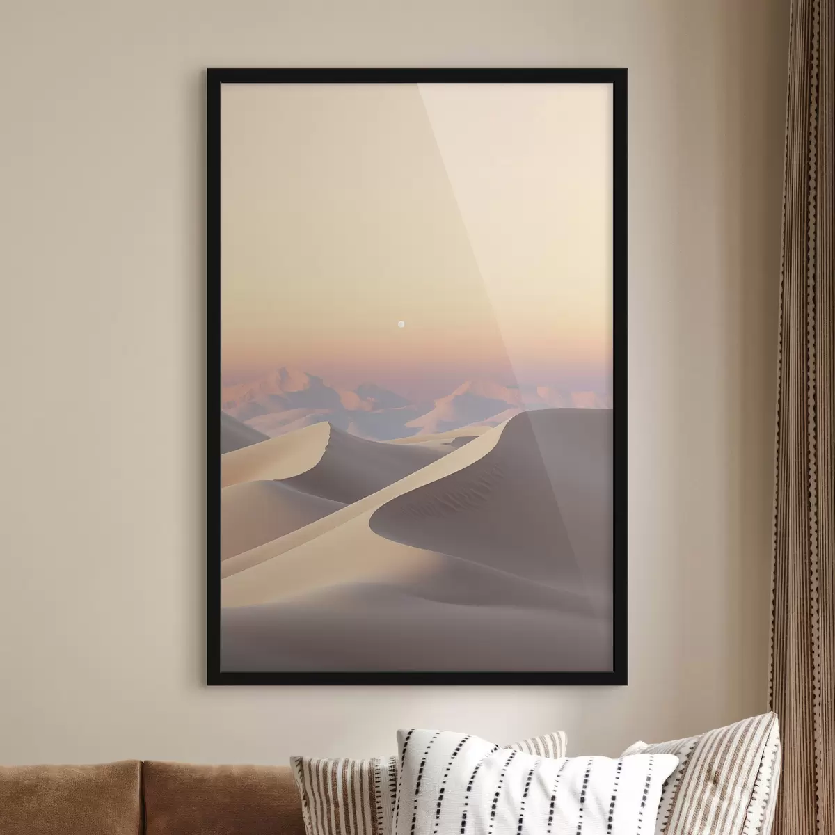 Poster Kõrbe maastik pehme pastellse taeva all, lainetavad liivaluited, taustal kauguses mäed Nr f47865