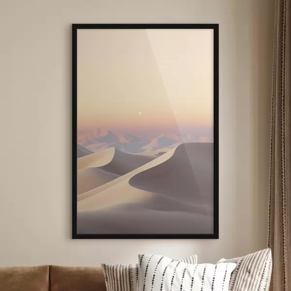 Plakat Kõrbe maastik pehme pastellse taeva all, lainetavad liivaluited, taustal kauguses mäed f47865