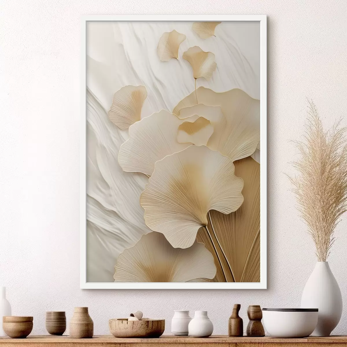 Plakat Ginkgo abstraktsed lehed tekstuurse, heleda taustaga, elegantne ja abstraktne kompositsioon f47868