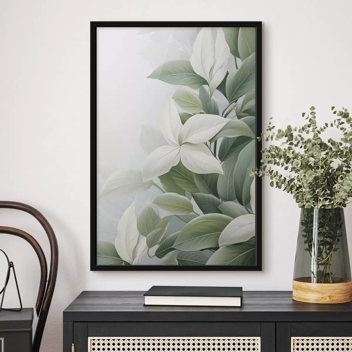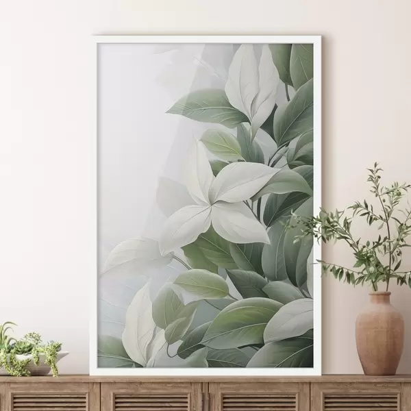 Plakat Valged lilled roheliste lehtedega, pastellne taust f47870